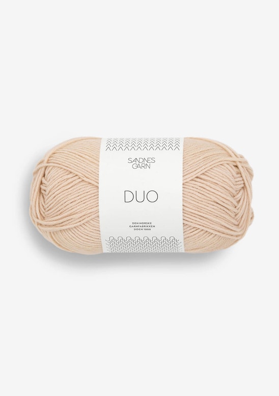 Duo från Sandnes GarnEtt behagligt garn som passar att användas året runt.Blandningen av merino ull och bomull gör denna kvalité till ett lätt och mjukt garn som isolerar bra.Fina kulörer och naturfärger där vissa är svagt svagt melerade som ger liv åt plagget.Bomullen kommer från Indien och merinoullen från Australien och Sydamerika. Ullen är garanterat mulesingfri.