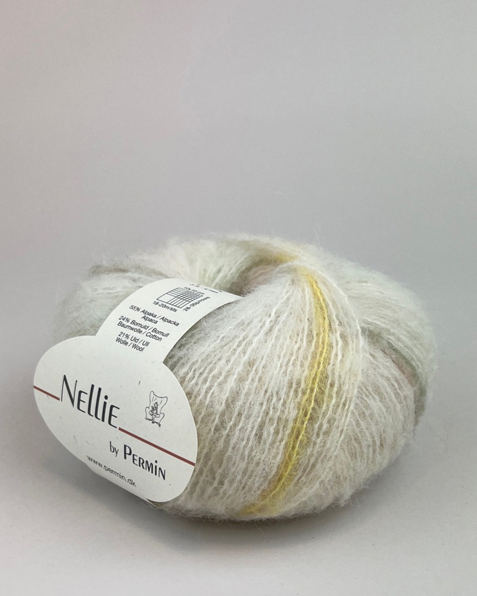 Är ett borstat alpacka garn i en luftig kombination med andra högkvalitativa naturfibrer.Alpackaull ger garnet en läcker lätthet och mjukhet och är behagligt temperaturreglerande och andas.Nellie lämpar sig därför för både sommar- och vinter stickning.Alpackaull är också antistatisk och noppar sig inte, vilket andra garn fibrer har tendera att göra.De flesta kommer också att upptäcka att det noppar sig mindre än andra ullfibrer.Färgskalan i Nellie är ljus, men varje nystan har en finrandig effekt, vilket gör att inget stick projekt blir det andra likt.Permin rekommenderar stickor 3½ - 4 mm och 18 – 20 m, men Nellie kan med fördel stickas på stickor 7 mm eller högre för att framhäva den luftiga looken.Använd även Nellie som följetråd med annat garn.