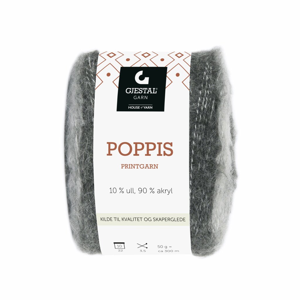 Poppis från Gjestal Garn Ett lätt och mjukt garn som kan stickas ensamt eller som en följetråd tillsammans med andra garn för en snygg effekt.Garnet för alla stickare som önskar sticka plagg utan mönster, men som ändå vill ha lite färgspel.De graderade färgerna har en mjuk övergång och ger en fin randnings effekt.Känns mjuk mot kroppen samtidigt som det lilla innehållet av ull ger lite värme.Vikt/Längd: 50g, ca 300mMaterial: 10% ull, 90% akrylStickor: 3,5mmStickfasthet: 22 maskor slätstickning på sticka nr 3,5 = 10cmTvättråd: