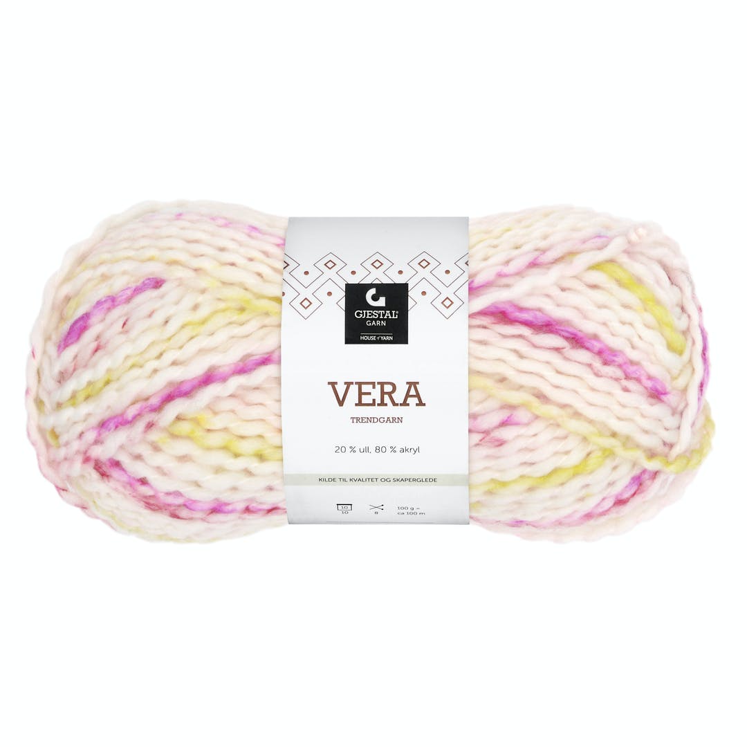 Vera från Gjestal GarnEtt tjockt och moderiktigt garn med fantasifullt färgspel.Garnet passar mycket bra till tröjor och accessoarer, men passar även till interiör.Stickas på grova stickor som ger snabbstickade plagg och är perfekta för nybörjare.Tillverkad i Turkiet