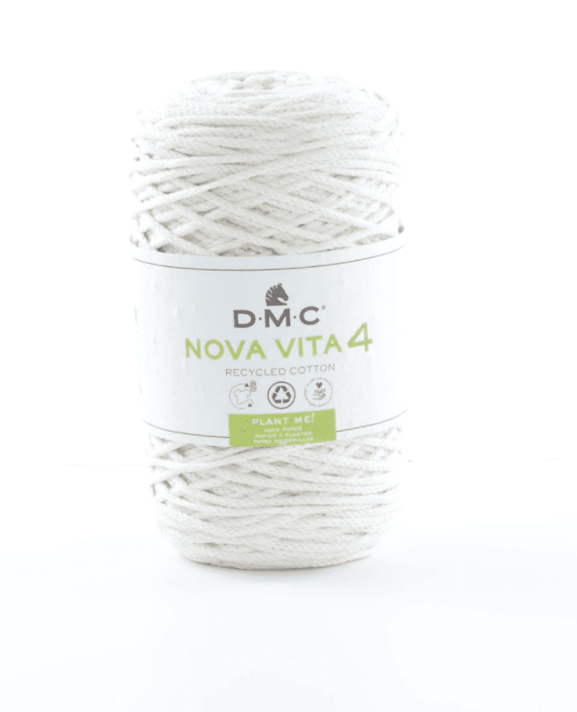 DMC Nova Vita 4 & Nova Vita 4 ColorÅtervunnet bomull- och polyesterförstärkt miljövänligt garn för virkning, stickning och makramé.Tillverka fina detaljer till hemmet, amplar, väskor och accessoarer.Lägg banderollen i blöt och se den gro, banderollen innehåller nämligen fröer.Växten kan bli fin att plantera i en egentillverkad ampel.Vikt/Längd: 250g, 200mMaterial: 80% återvunnen bomull, 20% polyesterStickor: 5mmVirknål: 4mmStickfasthet: 14mTvättråd: