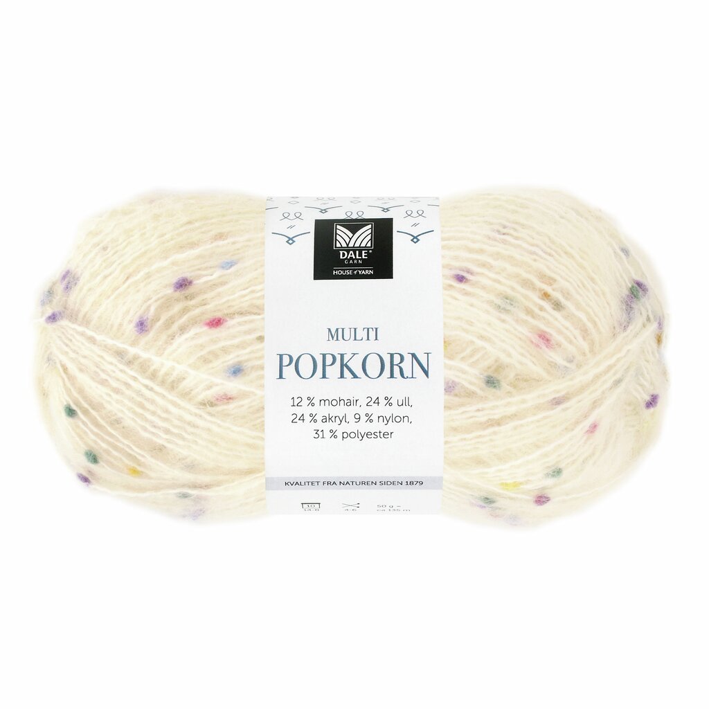 Multi Popkorn från Dale garnEtt allsidigt effektgarn som ger många möjligheter.Sticka med en eller flera trådar, med tunna eller tjocka stickor, eller sticka tillsammans med andra kvaliteter för en spännande effekt.Garnet är mjukt och smidigt och glider lätt på stickorna.
