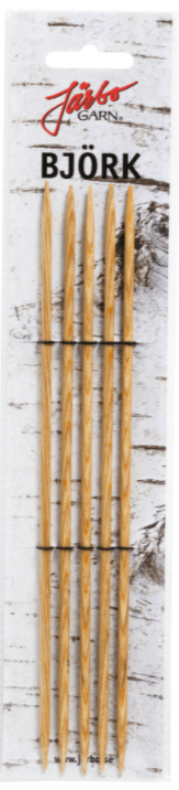 Strumpstickor Björk 20cm från JärboBjörk strumpstickor är 10, 15 eller 20 cm långa, vackra och glansiga.Perfekta till dina sockprojekt och även ärmar, mössor och stickning med liten omkrets.Varje förpackning innehåller fem stickor.Stick- och virkserien Björk är tillverkade av vackert björkträ, och håller en mycket god kvalité.Materialets yta gör att du får ett mjukt men ändå fast grepp, vilket ger dig full kontroll över ditt arbete.