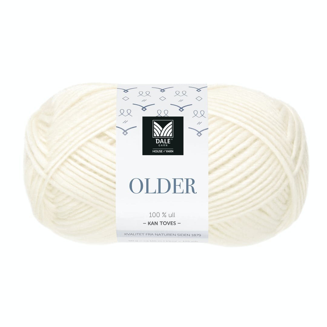 Older från Dale GarnEtt medeltjockt garn i ren, obehandlad ull, som lämpar sig mycket bra till fritidströjor, koftor, interiör och accessoarer.Garnet har en härlig rustik känsla och ger varma, slitstarka plagg med exceptionell andningsförmåga.Lämpar sig särskilt väl för mönsterstickning, eftersom strukturen och fylligheten i garnet bidrar till ett vackert, jämt stygnmönster.Kan även tovas till sittunderlag, tofflor, vantar och grytlappar.OBS! Blekt vitt garn GÅR INTE att tova. Naturvitt bleks inte.